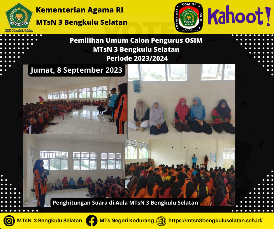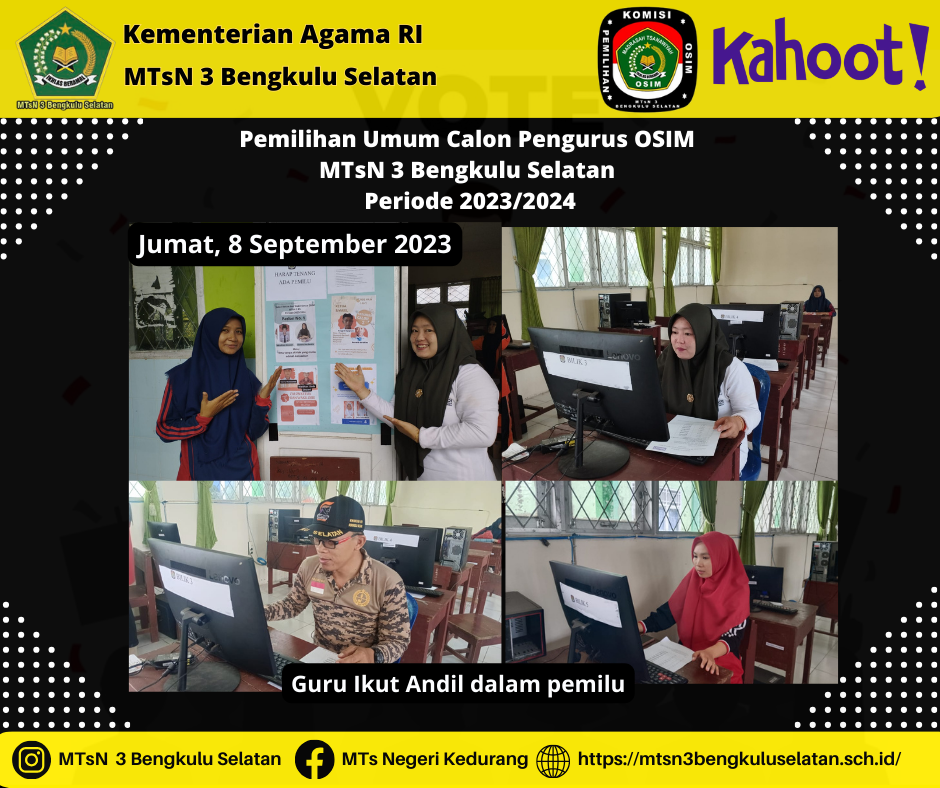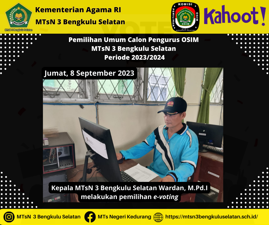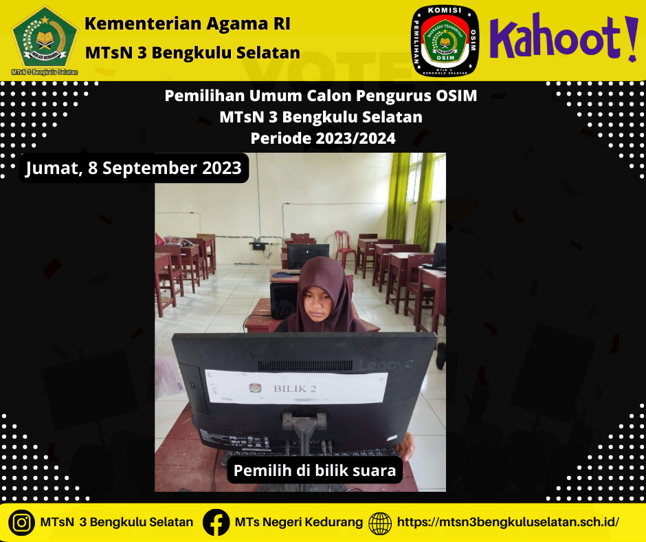 Pesta demokrasi pemilihan pengurus OSIM MTsN 3 Bengkulu Selatan tahun ini berjalan dengan lancar. Seperti tahun-tahun sebelumnya, pesta demokrasi tahun ini masih memakai sistem e-voting yaitu dengan menggunakan platform kahoot. E-voting digunakan selain untuk mempermudah proses pemilihan, juga dalam rangka mengenalkan siswa-siswi kepada teknologi pembelajaran yang berkembang saat ini.