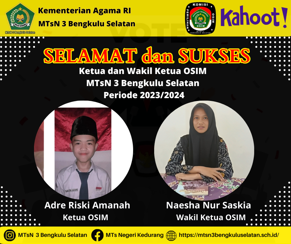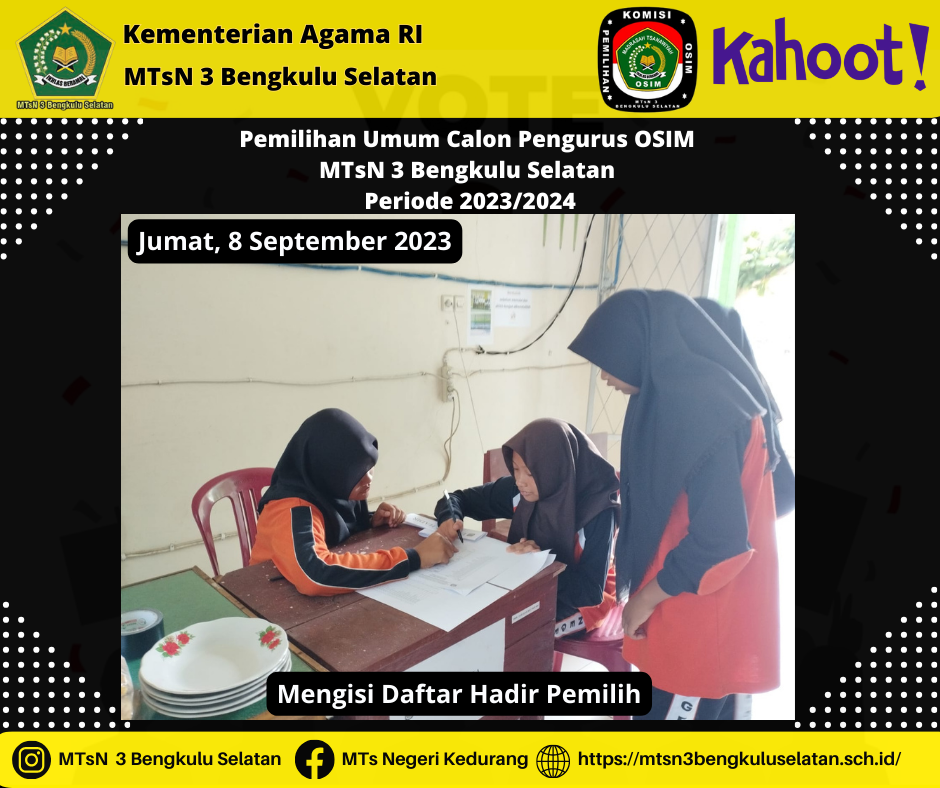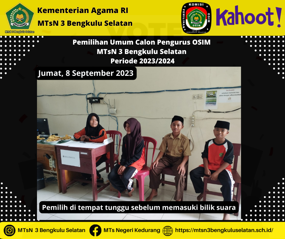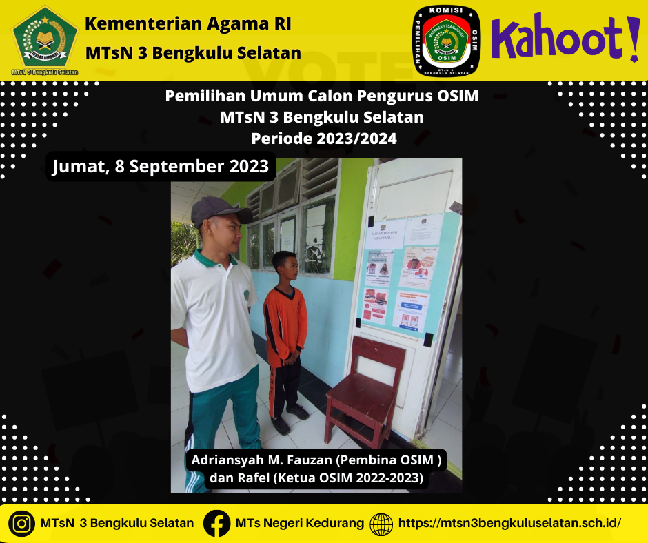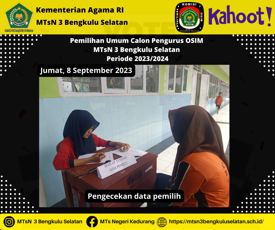 Pesta demokrasi pemilihan pengurus OSIM MTsN 3 Bengkulu Selatan tahun ini berjalan dengan lancar. Seperti tahun-tahun sebelumnya, pesta demokrasi tahun ini masih memakai sistem e-voting yaitu dengan menggunakan platform kahoot. E-voting digunakan selain untuk mempermudah proses pemilihan, juga dalam rangka mengenalkan siswa-siswi kepada teknologi pembelajaran yang berkembang saat ini.
