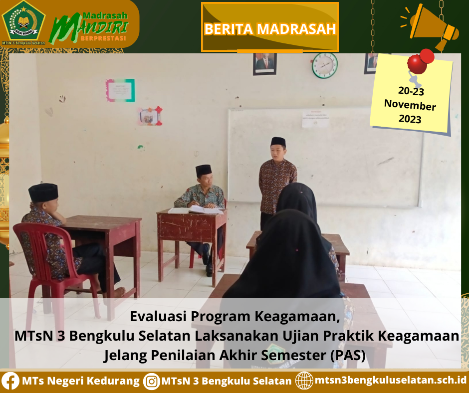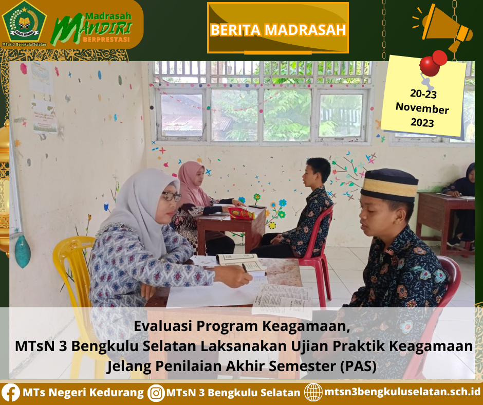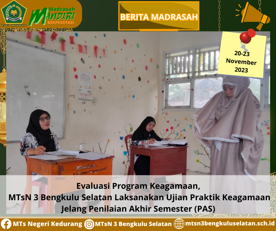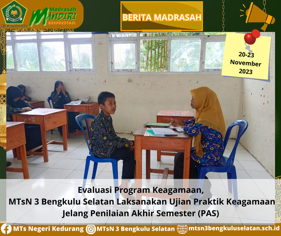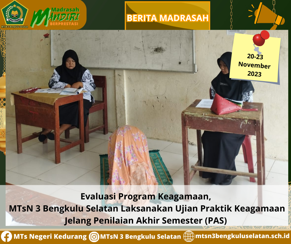 Dalam rangka mengevaluasi kegiatan dan pencapaian peserta didik dalam hal tersebut, MTsN 3 Bengkulu Selatan melaksanakan Ujian Praktik Keagamaan selama empat hari, yaitu pada Senin-Kamis, 20-23 November 2023. Materi ujian praktik yang wajib dikuasai oleh peserta didik pada ujian kali ini adalah praktik solat, zikir dan doa setelah solat, doa setelah solat duha, dan hafalan juz ‘amma dengan target tertentu setiap tingkatan kelas. Setiap kelas diuji oleh dua orang guru yang kompeten di bidang keagaman yang diuji.