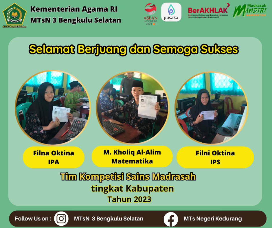 Dalam Kompetisi Sains Madrasah (KSM) ini, 2 dari 3 utusan MTsN 3 Bengkulu Selatan berhasil lolos ke Kompetisi Sains Madrasah (KSM) Tingkat Provinsi. Dua siswi tersebut adalah: