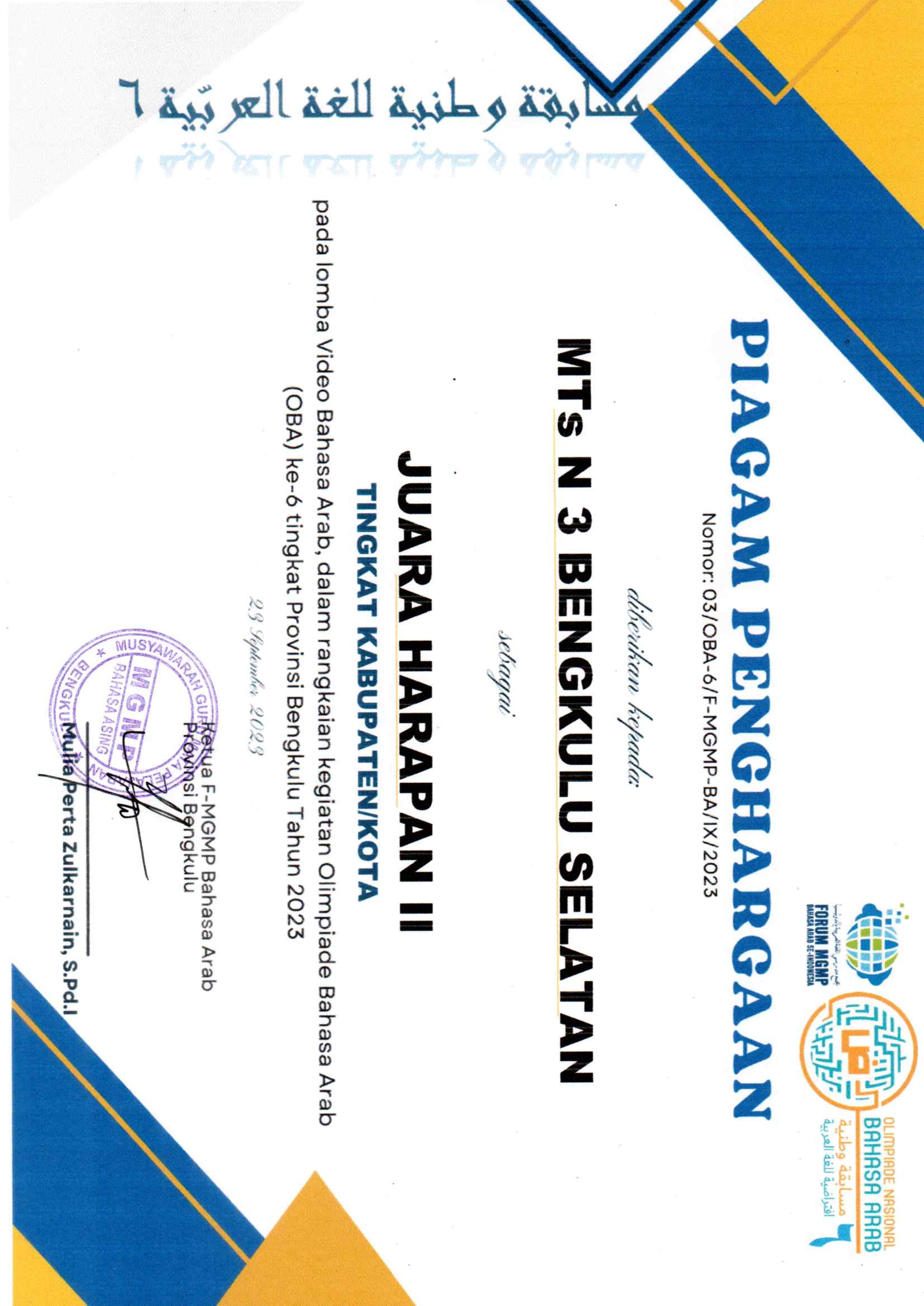 MTsN 3 Bengkulu Selatan Raih Juara Harapan II Olimpiade Bahasa Arab (OBA) ke 6 dan Lomba Video Motivasi Berbahasa Arab Tingkat Provinsi Bengkulu