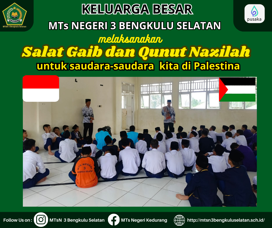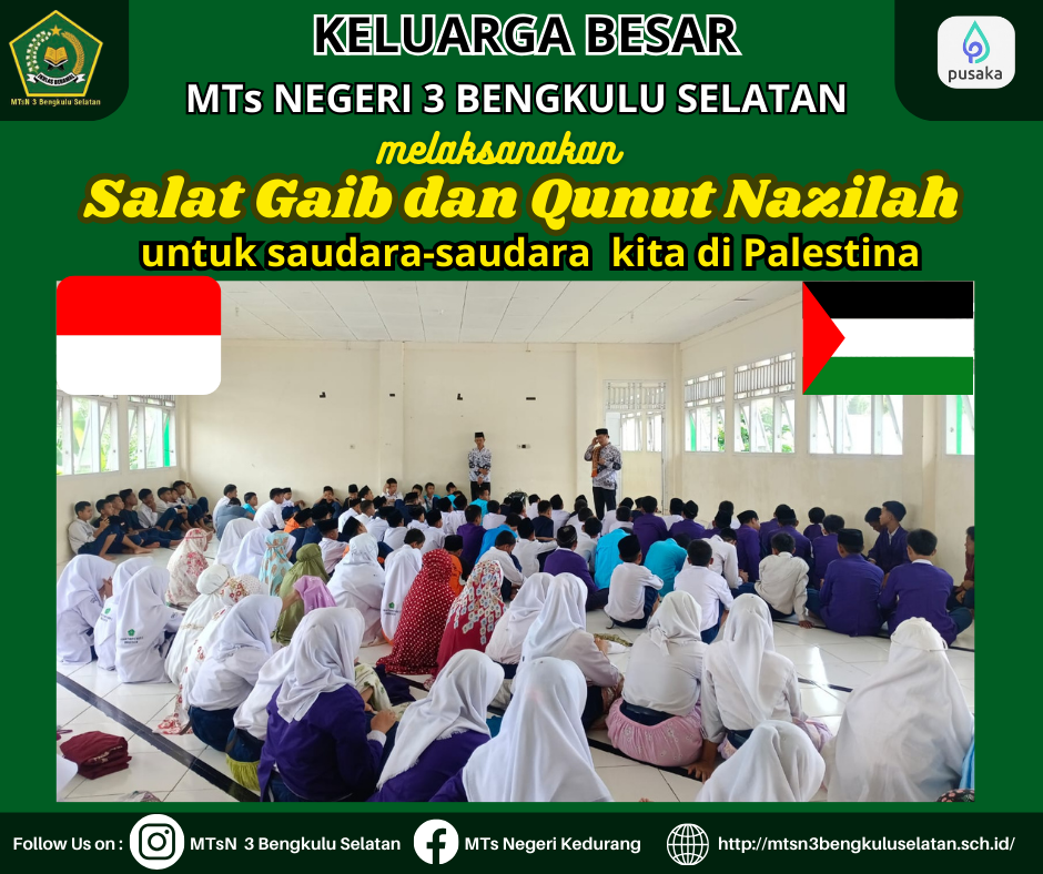 Sudah lebih kurang sebulan berlangsung agresi militer yang dilakukan oleh tentara Israel kepada rakyat Palestina. Tercatat sudah lebih dari 11.000 orang termasuk diantaranya lebih dari 8000 anak kecil dan perempuan menjadi korban dalam aksi tersebut. Untuk itu, Kementerian Agama menghimbau seluruh masyarakat untuk melaksanakan salat gaib dan qunut nazilah untuk mendoakan saudara-saudara kita di Palestina. Selain itu, para siswa dan guru juga mengumpulkan dana untuk bantuan kemanusiaan yang disalurkan melalui kantor kementerian agama kab. Bengkulu Selatan. Kegiatan ini sebagai bentuk keprihatinan, belasungkawa sekaligus dukungan agar saudara-saudara di Palestina dapat merdeka dari agresi militer yang dilakukan oleh para tentara zionis Israel.